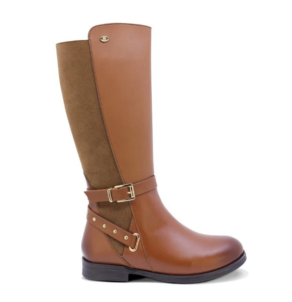 - Bota Alta de Cierre Tipo Equitación Para Niña y Jovencita en Tubo Corte Sintético y Corte Piel Tono Café Miel